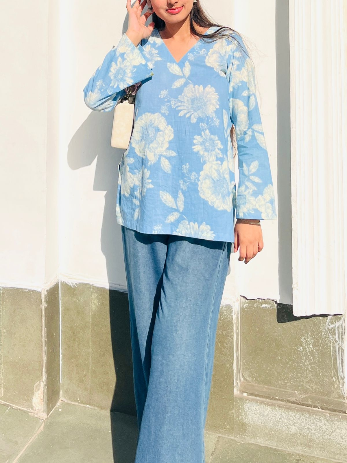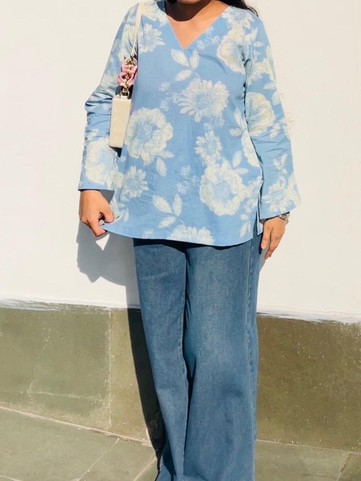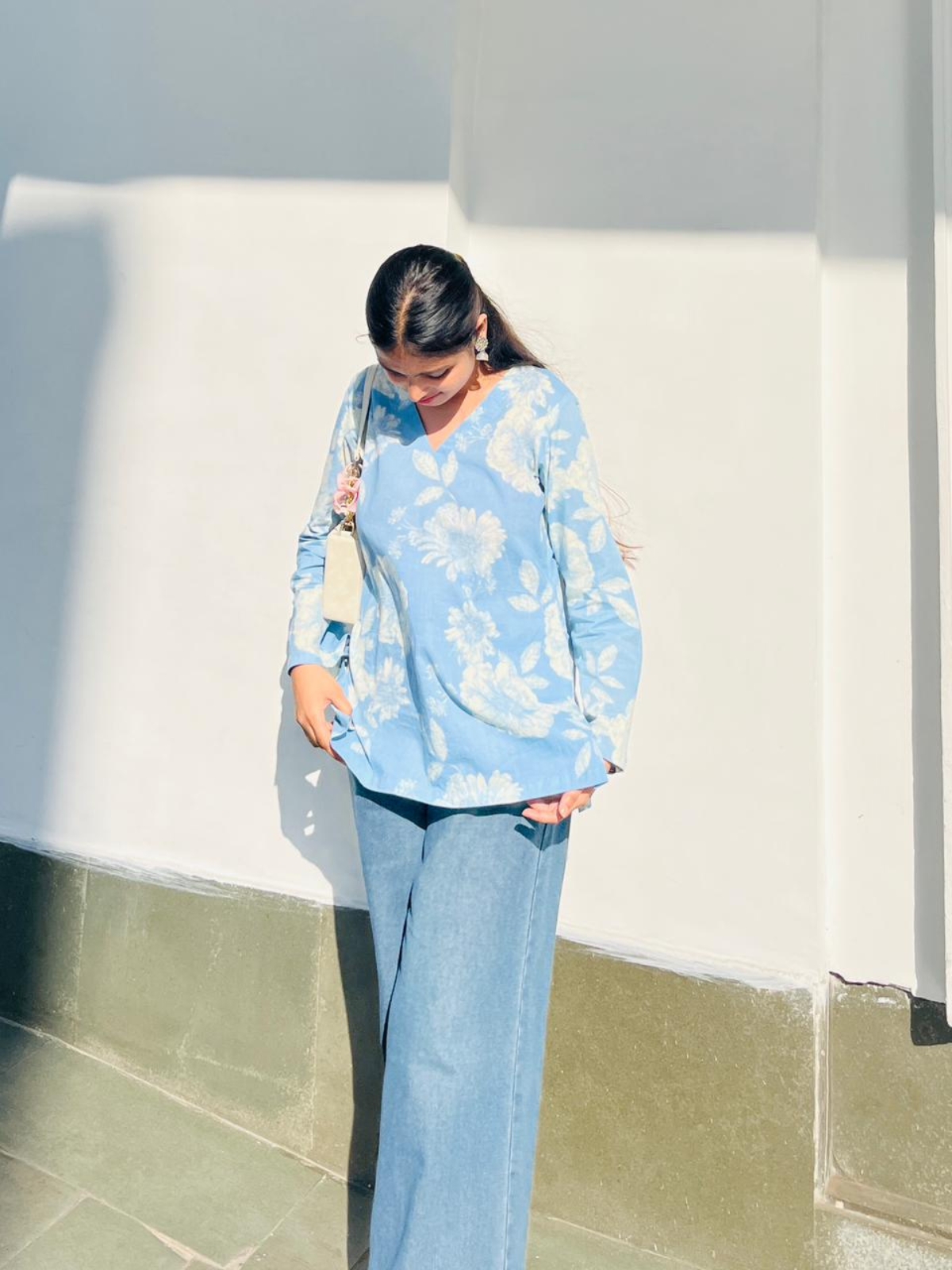 Designed in a soothing sky-blue hue with delicate floral prints, this kurti brings a fresh and calming vibe to your everyday wardrobe. The breathable cotton fabric keeps you cool throughout the day, while the relaxed silhouette ensures ease of movement.